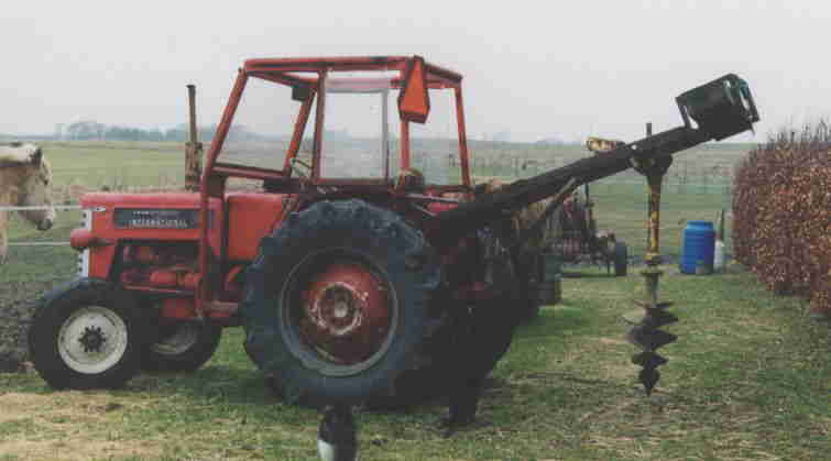 Her er så værktøjet, når der skal plantes vinstokke.Efter de 30 første huller med skovl & spade blev dette jordbor anskaffet. Det er jo desværre ikke alle der har dette udstyr. Men boret lavet et ca 80 cm dybt hul, med en diameter på ca 35 cm. på under 1 minut her i foråret ! Dette medføre at lerlaget og jorden under planten bliver løsnet og jordens fugt kan komme til plantens rødder. Rødderne har ligeledes lettere ved at trænge ned i dybden. Samme arbejde kan dog opnåes med en spade, men det giver sved på panden. I baggrunden over den blå vintønde, nå nej foddertønde, skimtes vinrækkerne. Læg også mærke til "bjerget" i baggrunden, selvfølgelig ligger mine vinrækker på en skråning. (ca 1m/10m)
